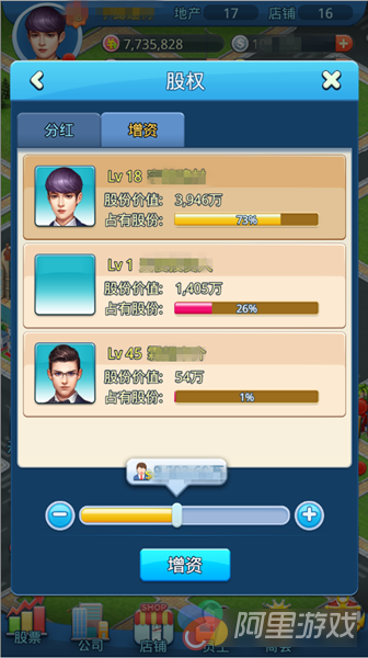 一个篱笆三个桩,一个好汉三个帮,在《大富豪3》的世界中同时适用。以往公司股权只是一个玩家跟npc的一个无聊的数字,但是在《大富豪3》。你可以通过邀请好友入股公司,将一部分公司股权交易给好友,从而获取一笔不菲的发展资金,从而扩大自己的商业版图。同时,也可以通过古人财富给公司增资,稀释公司各个股东的股权比例,稳固自己的领导权。