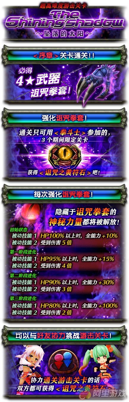 【活动内容】活动期间开放超高难度游击关卡TheShining shadow~坠落的太阳,副本掉落4★武器「诅咒拳套」升级必备材料<诅咒之黄符石>,被诅咒的副本同样被烙上被诅咒的规则,冒险家们可要小心了噢。