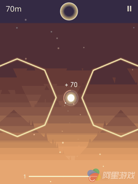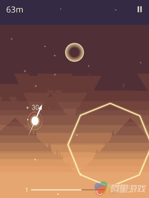 《伊卡洛斯(Icarus - A Star's Journey)》采用无尽模式进行,玩家可以看到在光球周围环绕着一圈刻度线,那其实就代表了你的生命值,当你要准备拉动屏幕发射光球时,这条刻度线就会开始逐步的减少,如果玩家没能在刻度线完全消失前达到下一个补给点的话(一个空心的大光球),该局游戏也就宣告结束了。所以玩家在游戏中时刻都将与时间展开赛跑,有着很强的紧迫感,而且每局游戏的场景都是随机生成的,会出现各种机关的障碍,其中红色机关是绝对不能有任何接触的,一下就能戳破你那脆弱的光球。