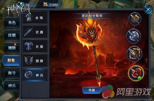 战士的神兵以神斧为原型设计的,品阶从低到高依次是“天煞”、“裁决斧”、“神罚一击”、“大地撕裂者”、“原初创世黎明”。