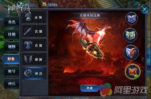 装备神兵后,角色界面对应显示神兵装备图标,装备第一阶的神兵后,可以激活神兵界面, 在人物界面也会出现神兵菜单。获得神兵后还可以进行培养,培养可以提升神兵的等级,获得更多的属性加成,神兵也有多种外形供选择,当然越是霸气的神兵,属性值也越高。