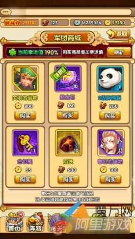 先说说第一种军团商城,在军团商城中每天有两次免费刷新的机会,之后的刷新都需要一定数量的金币才可以哦!据说在150%左右的幸运值刷到张春华信物的几率是最大的!