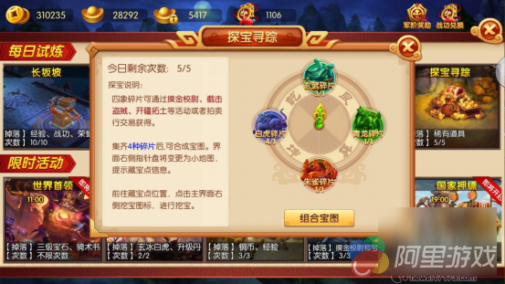 《明珠三国2》“探宝寻踪”玩法就是为喜爱探索的玩家精心准备的藏宝图游戏,只需达到33级便可参与,每日共5次机会。玩家在摸金校尉,截击强盗等活动或者通过拍卖从其他玩家处购买四象碎片,碎片足够后便可以合成藏宝图显示出某个地图中的某个点。玩家根据提示,去指定位置进行挖宝便可获得稀有奖励。