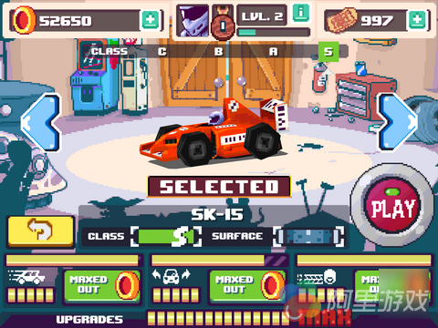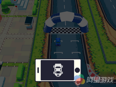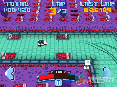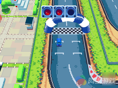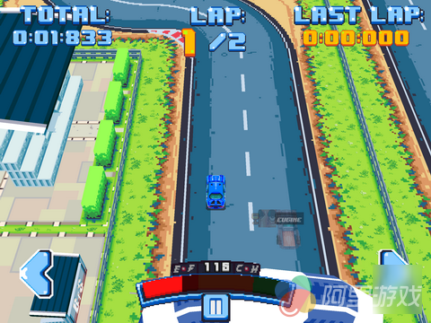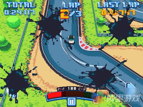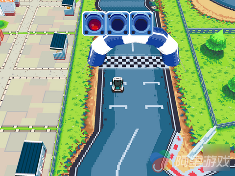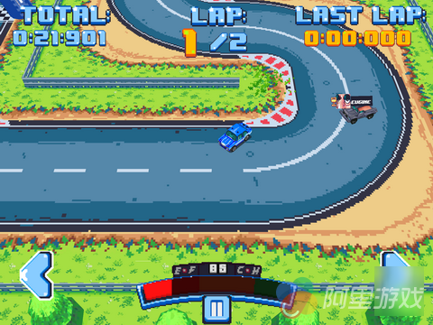 在刚进入游戏的时候玩家就将直接进入教程关卡中,不过游戏中的操作还是非常简单的,所以玩家不需要经过太多的时间就可以迅速熟悉游戏的玩法与操作。游戏采用了复古的像素风格的画面设计,不过并不会给人太过于敷衍了事的感觉,而且当玩家的赛车驶入一些特殊地点的时候,画面上也会出现相应的变化,例如驶出赛道的时候,地上的树叶会飞到玩家的屏幕上,阻挡一部分的视线,而在驾驶过油渍的时候,溅起来的油渍也会影响到玩家的视线,从这些细节可以看出开发商还是下了一定的功夫的。
