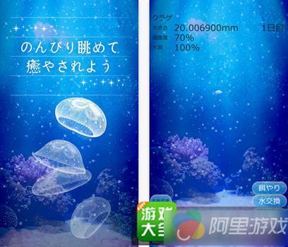 接下来可以试着点击画面,那样会产生一定水波,从而在手机屏幕上重现水母摇摇晃晃游着泳的姿态。看得差不多了就进入正题:养水母。画面右下方一排按键的第一个是喂食、第二个是换水,玩家平时不用刻意去做,只要想起来的时候打开游戏查看左上角的饱食度和水质,然后根据看到的情况去换水喂食即可,水母就会逐渐在照料下成长。