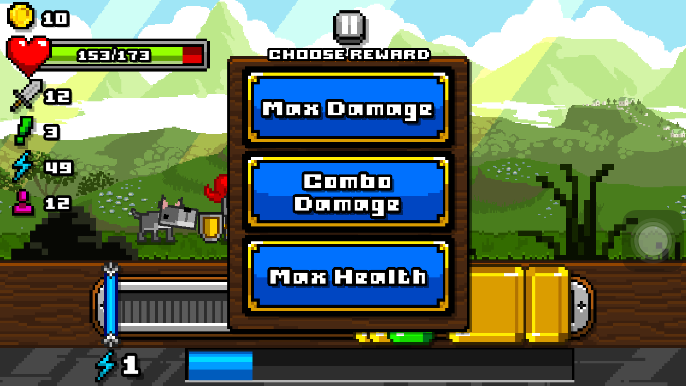 每当你打败一个敌人,就会出现增加属性的相关选项,能增加攻击、生命之类的属性。这可是游戏中非常重要的一环,由于血量不会随时补充,只能靠这时的选择补给,但补充血量又会浪费掉宝贵的机会,所以前期一定要少损血。至于增加属性的选择,自然是以攻击为主,提升血量上限为辅。最好的防守就是进攻啊!