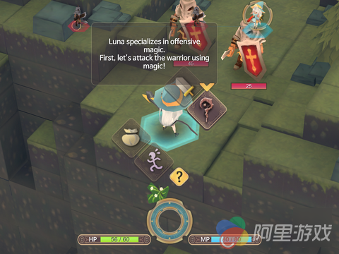 游戏中的操作方法还是非常简单的,在场景中玩家只需要点击任意一个位置即可让女巫移动到相应的位置,在场景中如果一些可以互动的地方和物品都会进行高亮显示,玩家直接点击即可进行互动,有一些是可以拾取的道具物品,而还有的则是可以进行训练的器械,而在敌人的周围会有一个战斗圈,当玩家进入到这个圈中的时候,玩家就可以查看到敌人的相关信息,如果玩家觉得自己有胜算的话,可以对其发起攻击。游戏采用了回合制的战斗系统,玩家可以看到双方的血量以及攻击造成的伤害。