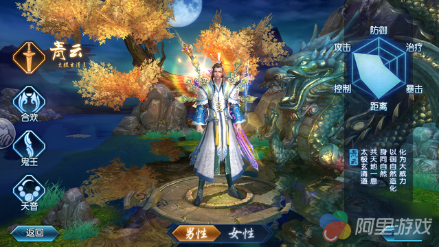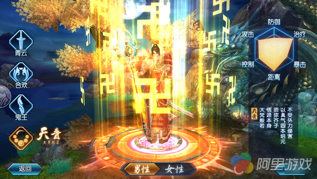 点开游戏,玩家会进行角色门派的挑选,目前游戏仅开放四个门派,它们分别是青云、合欢、天音和鬼王,皆取自书中设定。代入感十足。虽然以上四门并不算是端游中的热门职业,且均属于人族门派,但考虑到职业定位已经涵盖了近战、远程、输出、防御、奶妈等多种设定,因此实用性不错,职业特点也比较突出,只不过相较于拥有人、神、天脉三大种族,以及多达十几个职业的端游来说,难免让一些有职业爱好的老玩家感到遗憾,说好的牵机妹子、牵机妹子、牵机妹子呢?(重要事情说三遍)。