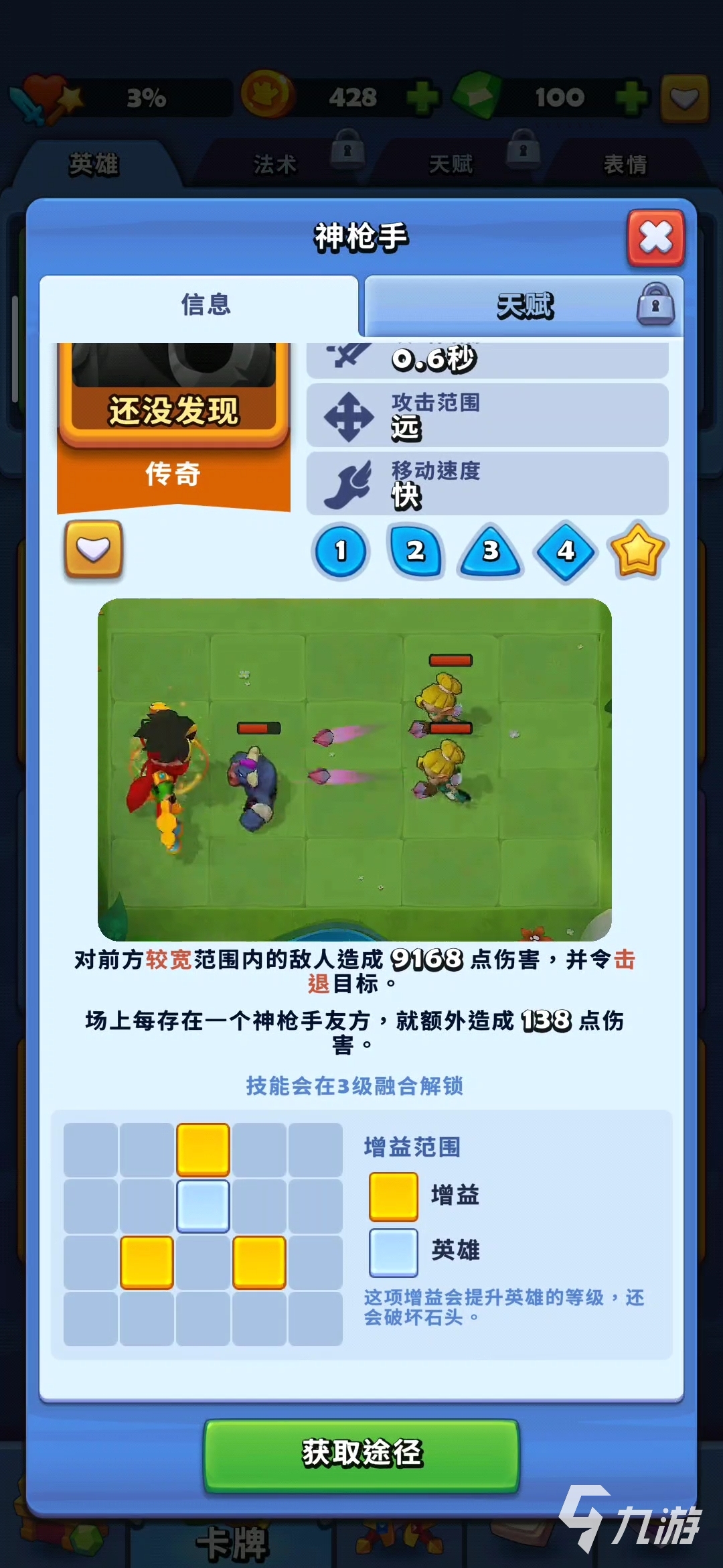神枪手的核心技能在3级融合后解锁。使用技能时,会对前方范围内的敌人造成9168点伤害,并把他们击退。如果队伍里有多个神枪手,还会额外造成138点伤害。简单来说,就是敌人越多,他的伤害越高,多个神枪手一起上场还能打出更强的群体火力,非常适合清理密集阵容。