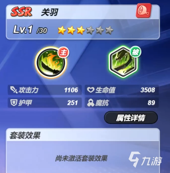 关羽是游戏里面的SSR角色。该作之中角色是有着稀有度的划分,正常情况下高稀有度的角色是比低稀有度的角色能力要强的。本次的关羽在游戏里面是传统的武圣形象,其使用的武器是青龙偃月刀,从目前数据来看,关羽总的来说各方面参数都很强,是一位很强力的人物,新人和老手都适用。