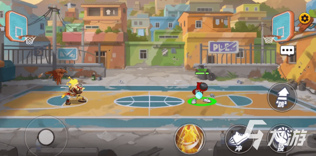 场内操作界面中将会有摇杆、跳、攻、投、冲、盖帽和技能,摇杆能控制角色移动,只要将其向着左右拖动,角色就会向着相应位置移动,跳点按一次,角色会进行一次跳跃动作,若是点按两次会进行一次高度跳跃,此时可以拦截到对手抛出的高球,需要注意若处于持球中无法进行两次跳跃,攻点按角色会向前拍打,命中敌人会削韧,连续击打时会将对手给击飞倒地,并击落对手手上的球,如果在空中状态使用,会变成向前拍击截击;