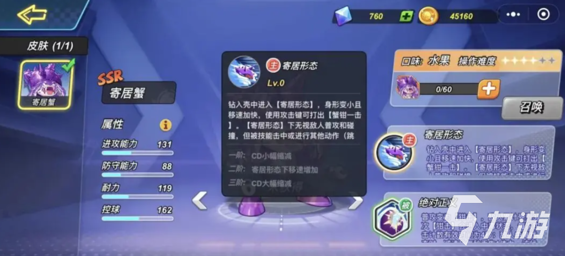 角色的选择也是至关重要,新手推荐齐天大圣和寄居蟹,寄居蟹非常灵活,可以变小自己的身型快速移动,并随时发起猛烈一击,他的主动技会变成“寄居形态”,简单来说就是变成一个移动速度很快,任何敌方的普攻都打不动的状态,此时点击攻击还能将上方敌人给夹碎,该角色缺点是跳跃高度会相对比较低,因此在面对擅长高跳的对手时,不要盲目跟随他们二段跳,在敌人跳起时看住时间,然后抢球并投篮;