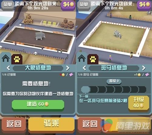 除了驯服新动物之外,还能开一个动物园。里面养着刚才捕捉到的动物,捕捉的越多就可以招揽游客来参观,自然大笔金钱就流进了你的口袋里。而有了钱就可以升级动物们的栖息地,还能提升捕捉新动物的技能,例如:斑马栖息地升级到1级的话,可以在斑马狂暴前多骑2秒。