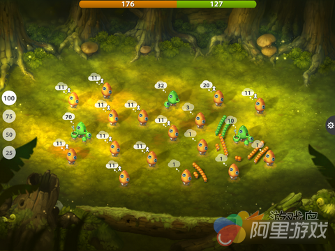 在初期的几个关卡中玩家将跟随教程熟悉游戏的玩法与操作,这些都与前作基本一致,游戏中玩家所要坐的就是控制自己的种族消灭敌人并占领所有的建筑物,玩家可以通过建筑物的颜色辨别所属阵营,当占领建筑物之后该建筑物就会不断的生产兵力,玩家在画面上方可以看到双方兵力对比,当两个阵营争夺一个建筑的时候兵力将会决定最后的归属。玩家只需要划动手指即可进行兵力调遣,通过画面左侧的按钮玩家可以调整一次调遣兵力的比例,要知道敌人可能会趁虚而入占领建筑的。而当建筑中的兵力到达一定数量之后玩家可以升级建筑,建筑物升级之后造兵速度和兵力上限都会得到提升,不过升级需要耗费兵力。