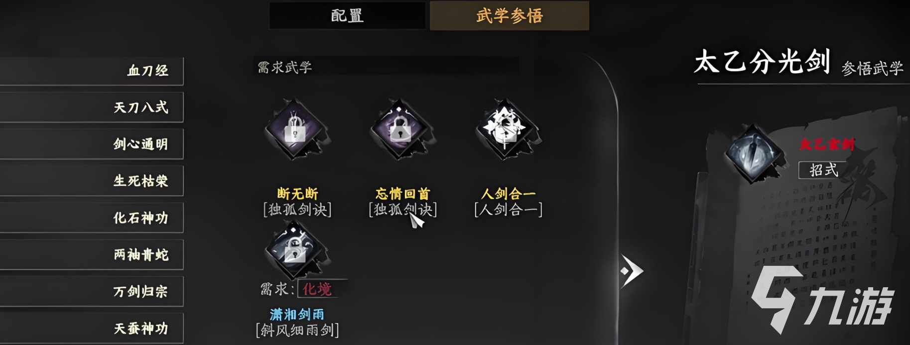 在武学秘籍中,玩家可以找到独孤剑诀,其中包含忘情回首和断无断两个剑诀。这两个剑诀需要满足一定的领悟条件,例如忘情回首需要破军丹和悟性125,断无断则需要灭军丹和剑术850。玩家可以通过游商购买丹药配方,并集齐材料进行炼制,完成条件后即可同时解锁这两个剑诀。