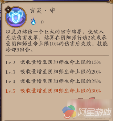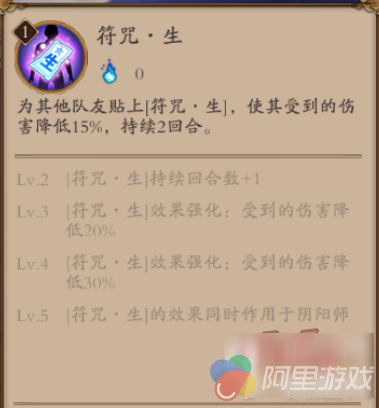满级效果如图,减伤30%,持续三回合,同时加持于阴阳师。这个技能和符咒。灭基本就是一正一反,但是这个BUFF可以被驱散,同时满级后作用于阴阳师意味着你本来就肉的阴阳师更肉了,还能配合一式奶自己(怎么感觉用一式的话亏了不止一点呢,讲道理,阴阳师通过一式是可以回1700+血量,但其他式神就没有这么多了,亏大了),是一个名副其实的万金油技能,但仍旧因为阴阳师的速度无法提上去,显得作用不是那么大。