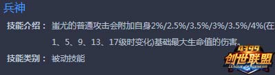 哎哎哎,不是叫大魔神蚩尤吗??,兵神什么鬼??这个被动还好啦。不算太强,也不是很弱,对于这个肉盾来说,还好啦。实战中一定要是不是的看一下,或者把那几个等级增益背下来,在那个时段进行一次猛攻,打出优势。