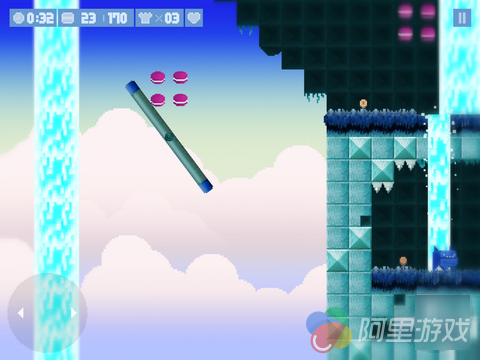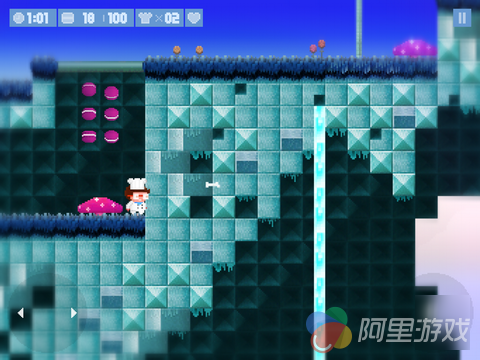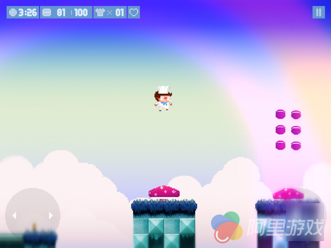 既然是横版的闯关冒险游戏,那么在玩法与操作上相比应该还是比较传统的,游戏中的操作主要通过虚拟按键的方式进行控制,左下角的方向键负责控制帕克的移动,而右侧的A键则主要负责跳跃了,不过这个天赋异禀的厨师居然一开始就掌握了二段跳,玩家可以在其跳跃的过程中再次点击A键让其再次起跳,掌握好跳跃的时机可以让帕克顺利的跳到更高的平台上。