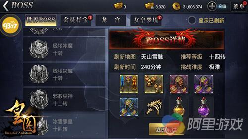 而新地图的推出,自然就意味着更强新BOSS的降临!而在《皇图》新版本推出的新地图“天山雪脉”当中,便迎来了力量凌驾于其它一切BOSS之上的新BOSS——冰雪熊皇!新BOSS“冰雪熊皇”的推荐挑战等级为十四转,可见其挑战难度也比其它BOSS要高上许多!