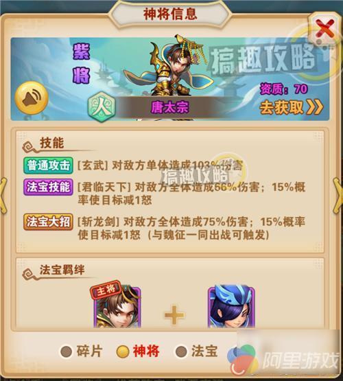 法宝大招:【斩龙剑】对敌方全体造成75%伤害;15%概率使用目标减1怒(与魏征一同出站可触发)