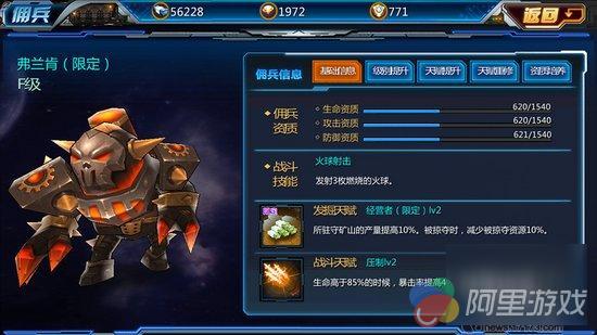 此为限定佣兵,带个限定天赋,这个天赋挺不错的,比一般的加矿山产量的那个发掘天赋加成还多一些。但是在副本中,它会默默的冲上去,然后默默的一巴掌一巴掌的拍人,偶尔鞠个躬丢出3坨火球。感觉相当中规中矩的感觉。这个技能打BOSS挺好用的,3个火球全命中的话伤害还是相当不错的,技能的频率也很高。这个佣兵的资质资质也和这个佣兵的特点一样的中规中矩,平得和切菜板一样。