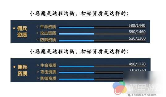 下面我们对比2个远程佣兵:小恶魔VS探索者——从对比中可以发现探索者的攻击资质比小恶魔要高出很多,但生命则要低不很多。