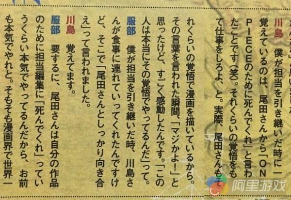 近日,《周刊少年JUMP》的编辑爆出尾田荣一郎对工作的严格要求,他甚至对编辑说:“为了《航海王》给我去死。”(温和点翻译是“拿出死的觉悟为《航海王》工作”),又一次让日宅见识到民工漫也不是随随便便就能水出来的。