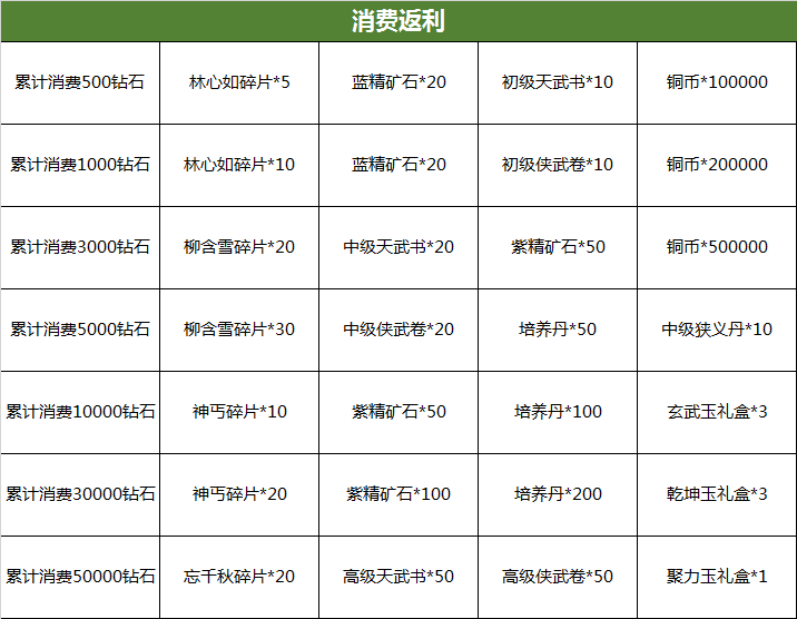 活动内容:累计消费钻石数(红蓝钻均计算在内)达到对应档次即送对应回馈福利,平均返还比高达30.8%