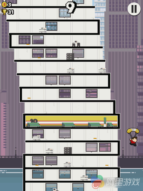 游戏中路上会有各种障碍,当然也会出现很多水果,玩家们需要想方设法躲避障碍,而且要尽可能的收集到水果,因为水果在跳跃到存档楼层的时候可以帮助我们存档。游戏中我们每跳跃到一个楼层,就可以进入右边的小房间去存档,可以花费一定数量的水果来打开箱子,也可以观看视频广告来打开箱子,这样都能进行存档。存档以后若不小心碰到障碍死亡,也可以从存档的楼层继续开始,非常有人性化 ,让玩家们没有了后顾之忧,不然若每一次死亡都必须要从最起始点开始,相信很多玩家都会崩溃吧。
