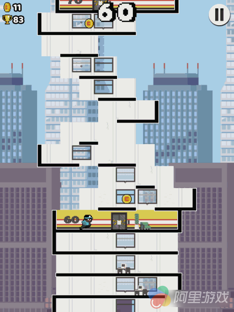 游戏的操作非常简单,玩家们通过手指点击屏幕就能控制小怪物跳起来了,当小怪物在空中的时候还能再次点击进行二段跳,这是很多跑酷类游戏所常见的方式。本作中我们要通过墙壁反弹的方式来跳到各种高台上面,小怪物碰到墙壁就会如同壁虎一样黏住,同时缓慢下滑,这时候玩家们可以继续以墙壁为支撑点进行反弹跳跃,轻松到达高台。本作的反弹跳跃是挑战的重点所在,很多时候必须要通过合理的走位和选择墙壁才能到达目的地,同时如何控制跳越的高度以及距离,这些都是玩家们需要去思考的地方。