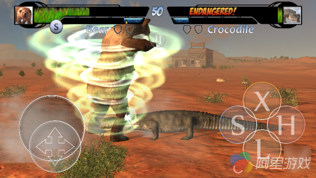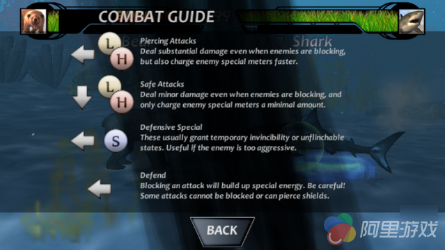 介绍完了游戏中各类的角色,咱们再走进赛场,亲自看看游戏中那九死一生的对局。游戏在模式上分为剧情模式、格斗模式以及丧尸模式,其中丧尸模式需要达到一定的玩家数量才能开启,因此在这里暂且按下不表。至于其他的两种,玩法则比较相似,主要就是选取角色、选取场景、进行PK。具体到任意的一场对局当中,进入游戏后,系统便开始倒计时,游戏的胜负判定非常简单,谁的血量先被扣完或者时间结束谁的血量较少,那么它无疑就是对局的失败者。游戏中被击打会产生怒气值,怒气值达到一定程度玩家就可以释放必杀技。当然,需要吐槽的是游戏的血条设计有点不走心。绿色的草是什么鬼啊?海豚、鲨鱼、狮子等表示这东西我们不吃,压力很大啊。