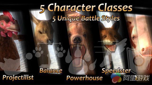 根据速度、力量、体形等方面的差异,游戏将角色分成了五种类型,它们分别是:擅长使用飞行道具攻击对手的“Projectilist(神射手)”如母鸡、海鸥;拥有绝对力量的“Powerhouse(力量党/精力旺盛者)”如狮子、熊等动物;以防御力见长的“Tank(坦克)”如“奶牛”和“长颈鹿;动作迅速强求稳准狠的“Speedster(速度之星)”如狐狸;还有最后的种族“Balancer(平衡者)”如袋鼠和山羊。玩家可以根据自己平时游戏的风格进行选择。