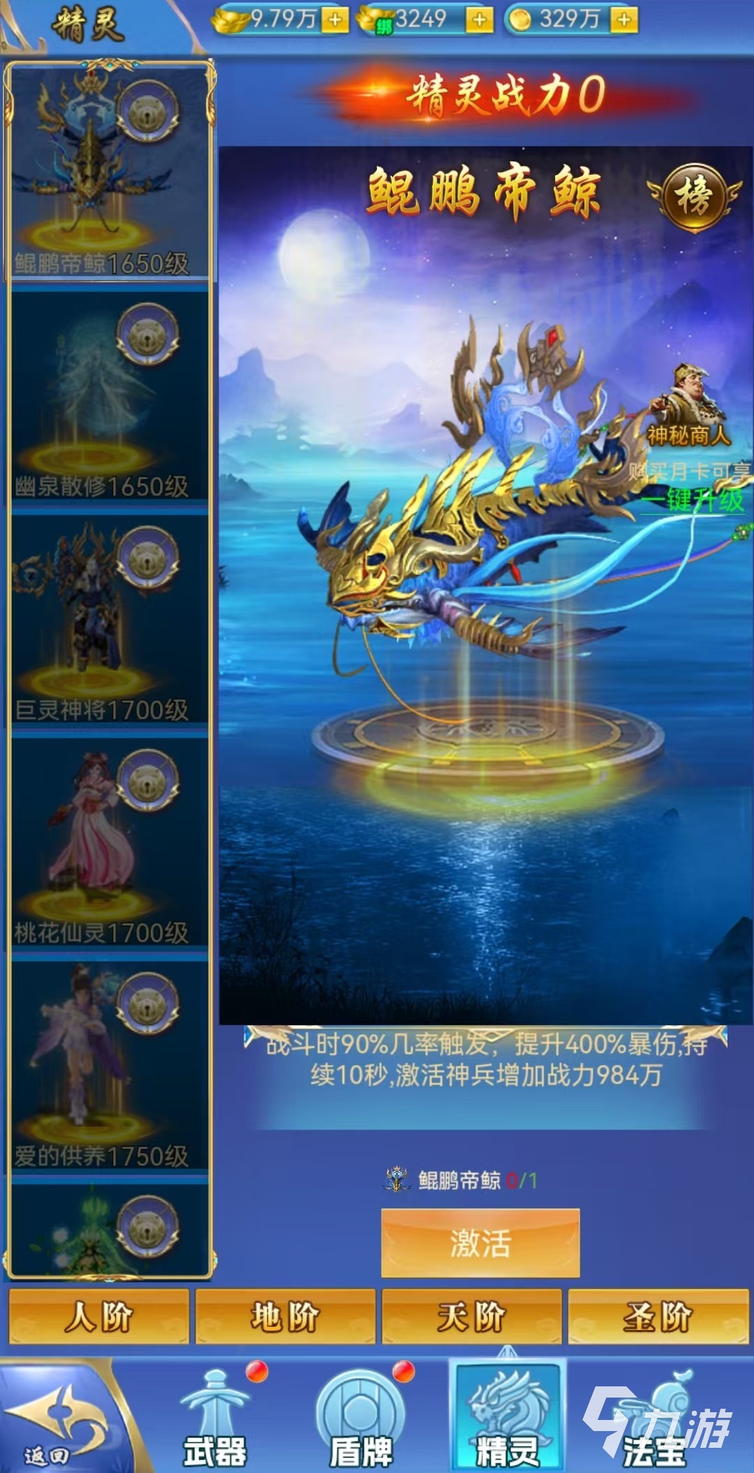 盾牌的代表神器包括钢铁之心、幽狼咆哮、龙鳞玉玺等。钢铁之心的效果是触发后提高爆伤减免,幽狼咆哮触发后提升超爆属性,龙鳞玉玺触发后可以提升韧性。精灵主要包括鲲鹏帝鲸、幽泉散修、桃花仙灵等。鲲鹏帝鲸触发后提升爆伤,幽泉散修触发后提升超爆加伤,桃花仙灵提高伤害加深效果。法宝主要包括盘古开天斧、太初清萍剑、太上造化炉等,这些主要通过限时活动中才能激活。