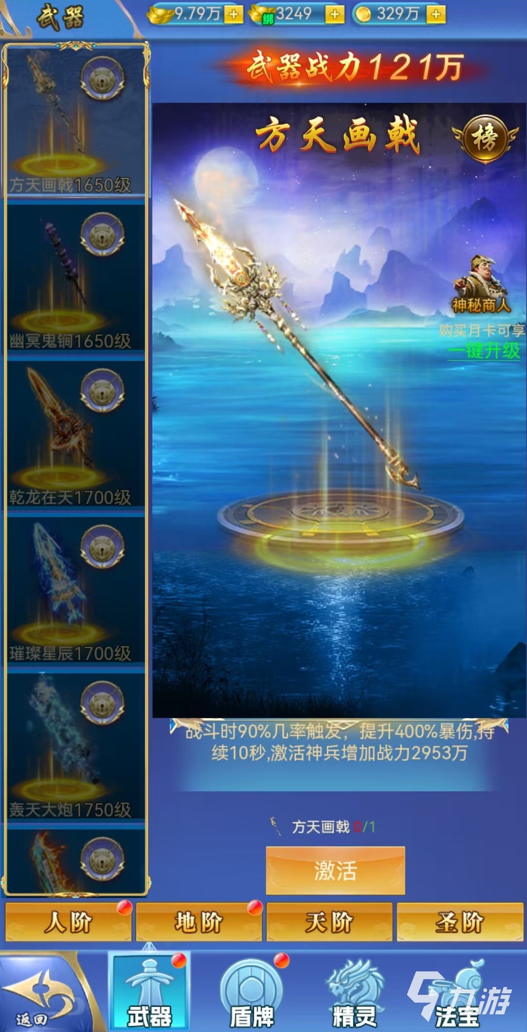 游戏中的神器一共有4种,分别是武器、盾牌、精灵和法宝,每种神器都分为4个不同的品阶,从低到高,分别是人阶、地阶、天阶和圣阶。每种神器都拥有自身独特的技能效果,已经激活的神器技能和属性,都会同时生效,这一点很多玩家都容易忽略。激活的神器越多,技能也就越多,自然作用也就越强大。很多高难度的boss战斗,就是依靠这些神器技能才能战胜目标。