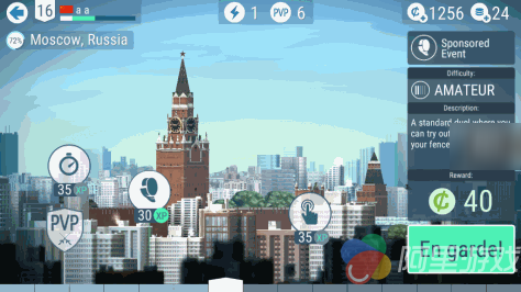 在莫斯科比赛期间的界面,右侧是所选挑战的说明。左上角显示的是玩家等级、ID和当前城市的经验条;顶端的是体力值;右上角显示的是钞票和金币持有数,可以用来购买已经解锁的新装备或体力;底端的进度条疑为任务总进度,一个城市算一格