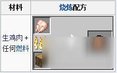 虽然很危险,但是熟鸡肉可以像其他熟食一样从被烧死的动物身上获得。食用生鸡肉恢复的饥饿值只有熟鸡肉的1/3,而且还会有30%的几率导致食物中毒。