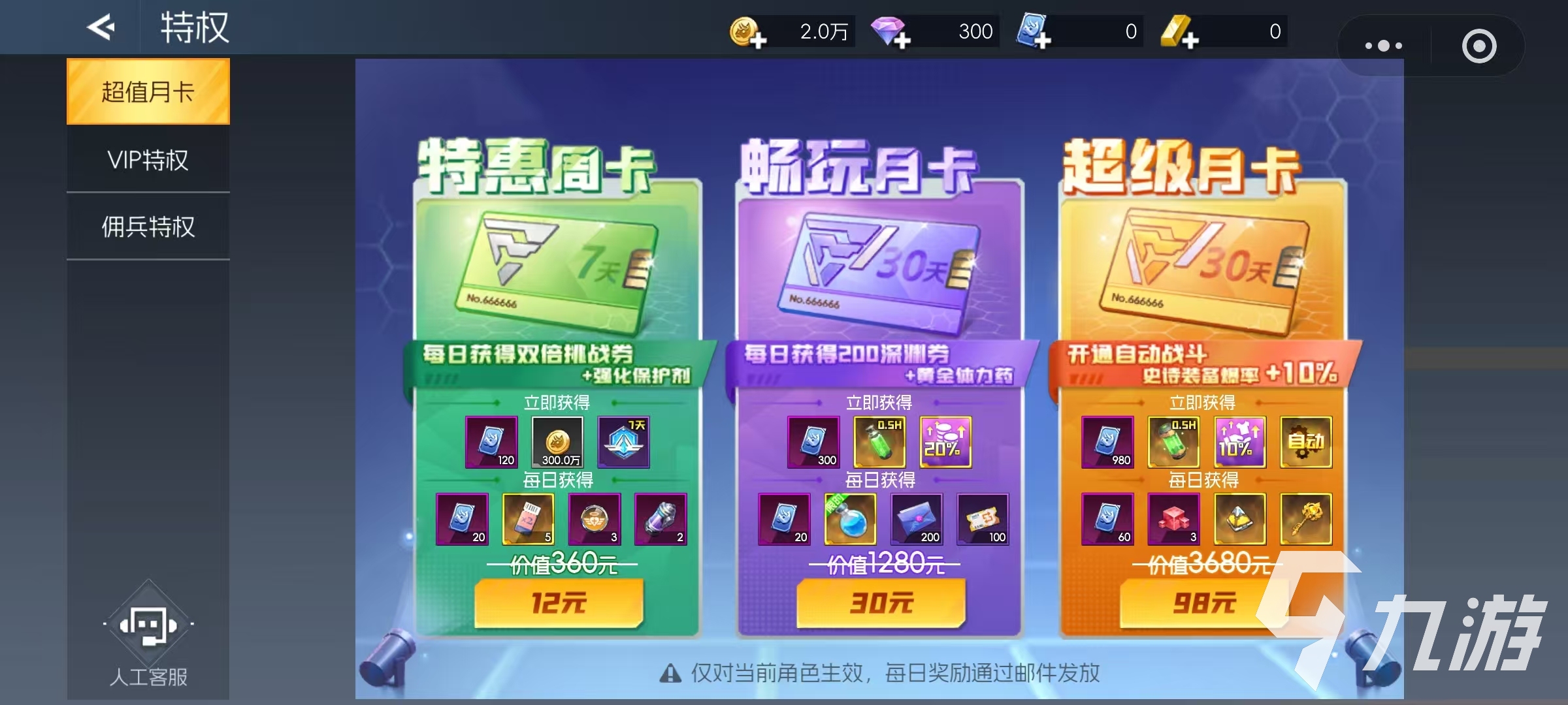 大家进入游戏后,在界面的左上角就可以进入到特权中,目前游戏的特权主要包括超值月卡、vip特权和佣兵特权这三类。先看一下超值月卡。一共分为特惠周卡,畅玩月卡和超级月卡这三类。开启特惠周卡后,每天可以获得双倍挑战券和强化保护剂,开启畅玩月卡后,每天可获得二百深渊卷和黄金体力药。开启超级月卡后,就能开通自动战斗,另外史诗装备的爆率能够增加10%。