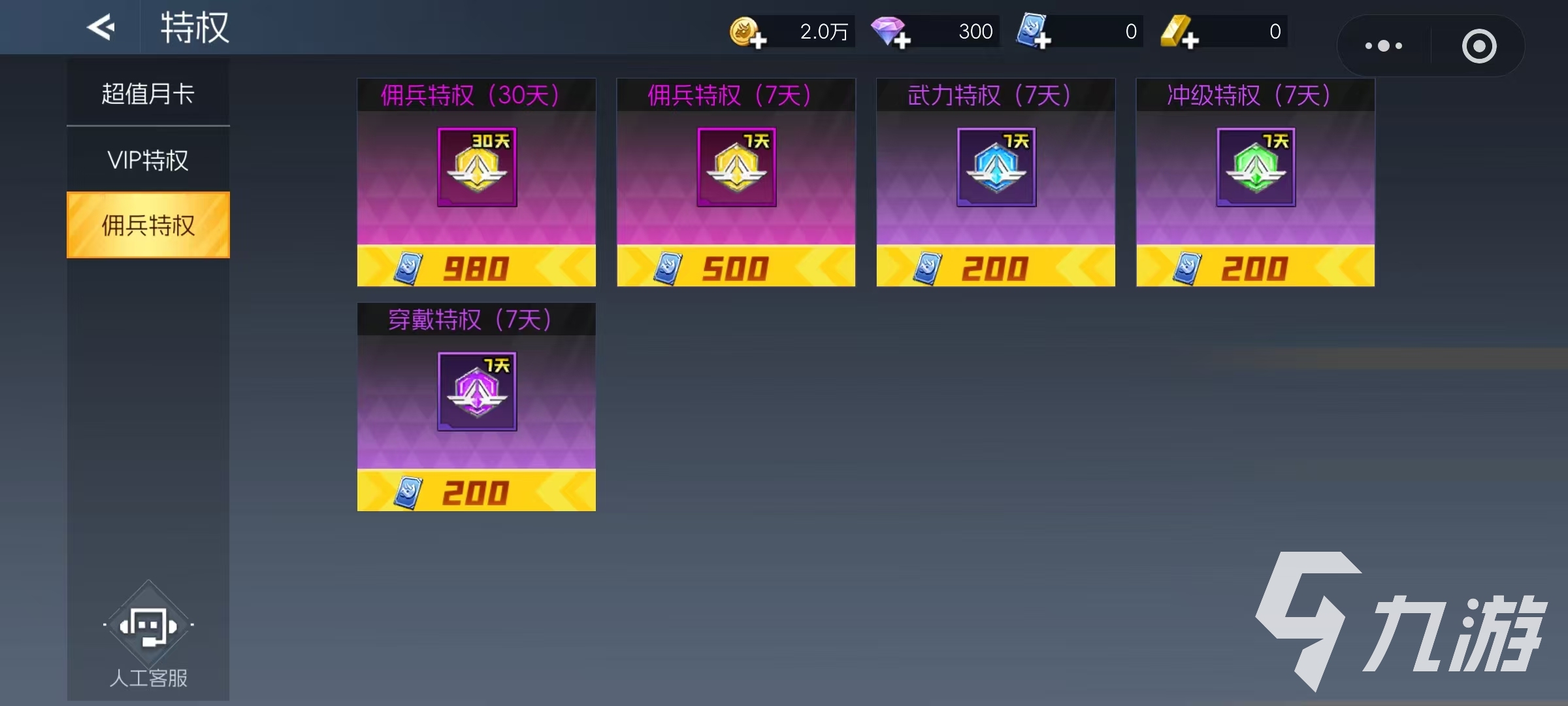 在佣兵特权中,包括佣兵特权、武力特权、冲级特权和穿戴特权这些类。因为这些特权需要点券就可以直接打开,玩家通过充值月卡所获取的点券积攒起来,就可以将这些特权全部开启。佣兵特权购买后,可以将其他的特权全部打开,是最划算的选项。武力特权能使得技能等级提升,冲级特权使得主线关卡获得的经验提升,穿戴特权能使装备穿戴等级减少5级。
