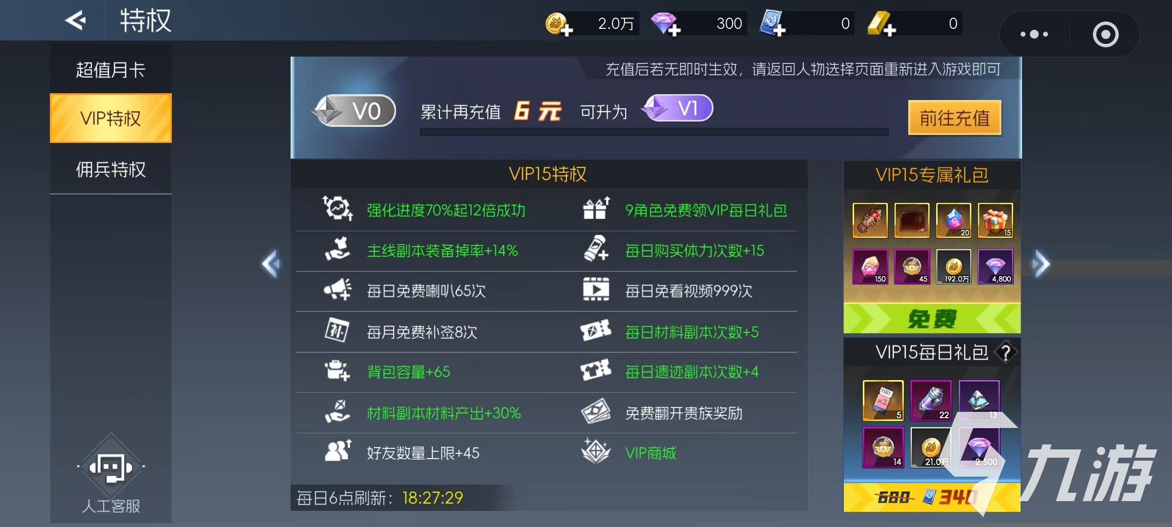 这里小编的建议是一定要打开超级月卡,尽量三卡全开,这样整个游戏就会变得非常简单。自动战斗能够应付绝大多数战斗,而且开启月卡和周卡后,所赠送的每天奖励和一次性奖励,对于前期发展战力也有着重要的作用,只需要100多元就能全部拿下,非常划算。Vip特权是通过充值来自动开启的奖励,如果大家将上面所说的月卡周卡全部打开,就可以自动开启对应的vip等级。Vip等级越高,所能享受的特权也就越高,目前vip最高开放到15级,特权非常丰富,包括强化成功率提升、主线副本装备掉落提升、每天有免费的喇叭次数、免看视频次数和免费补签次数。另外还有对应的vip专属礼包,每天可以购买大量体力,这绝对是氪金玩家的专属。即使是普通玩家,也强烈建议达到vip5特权,这对于每天刷材料有着很重要的帮助。