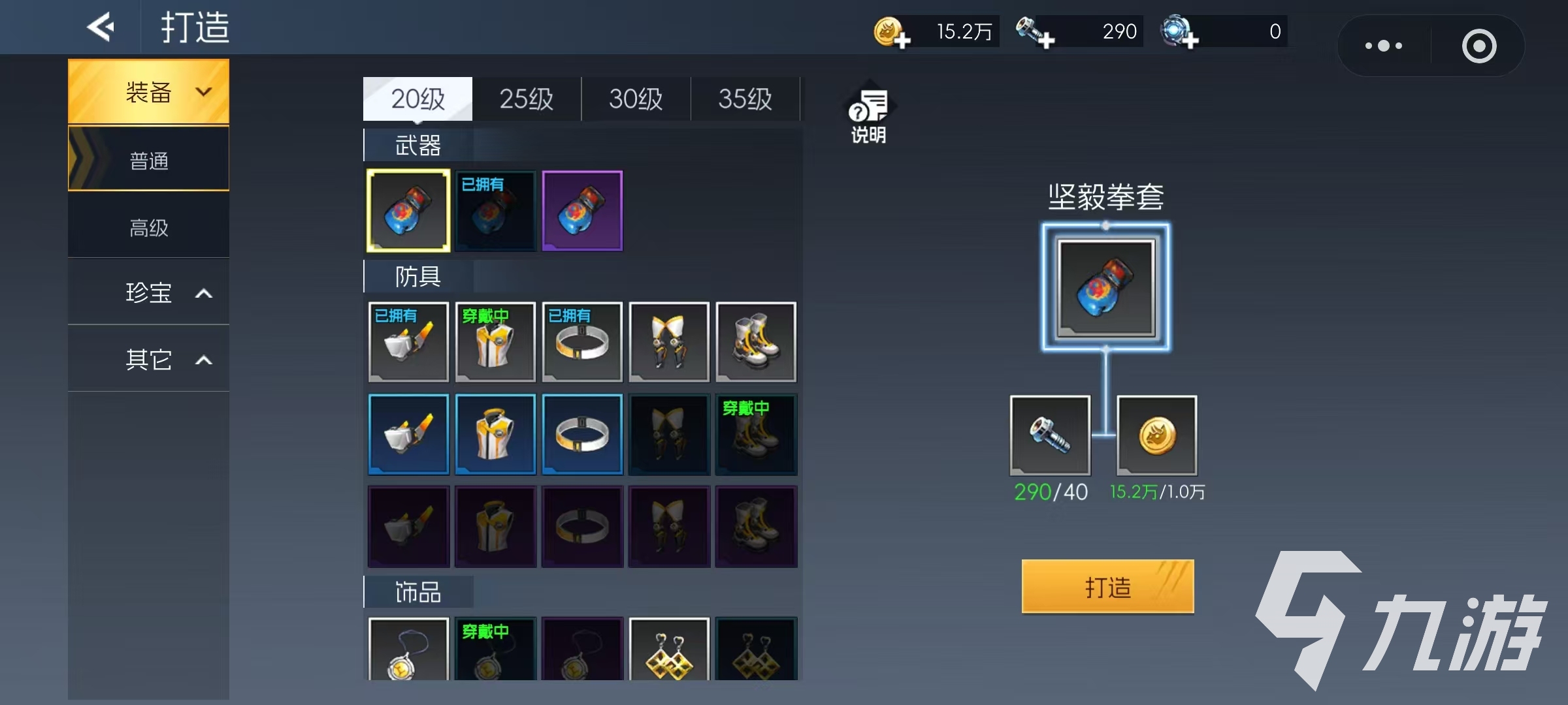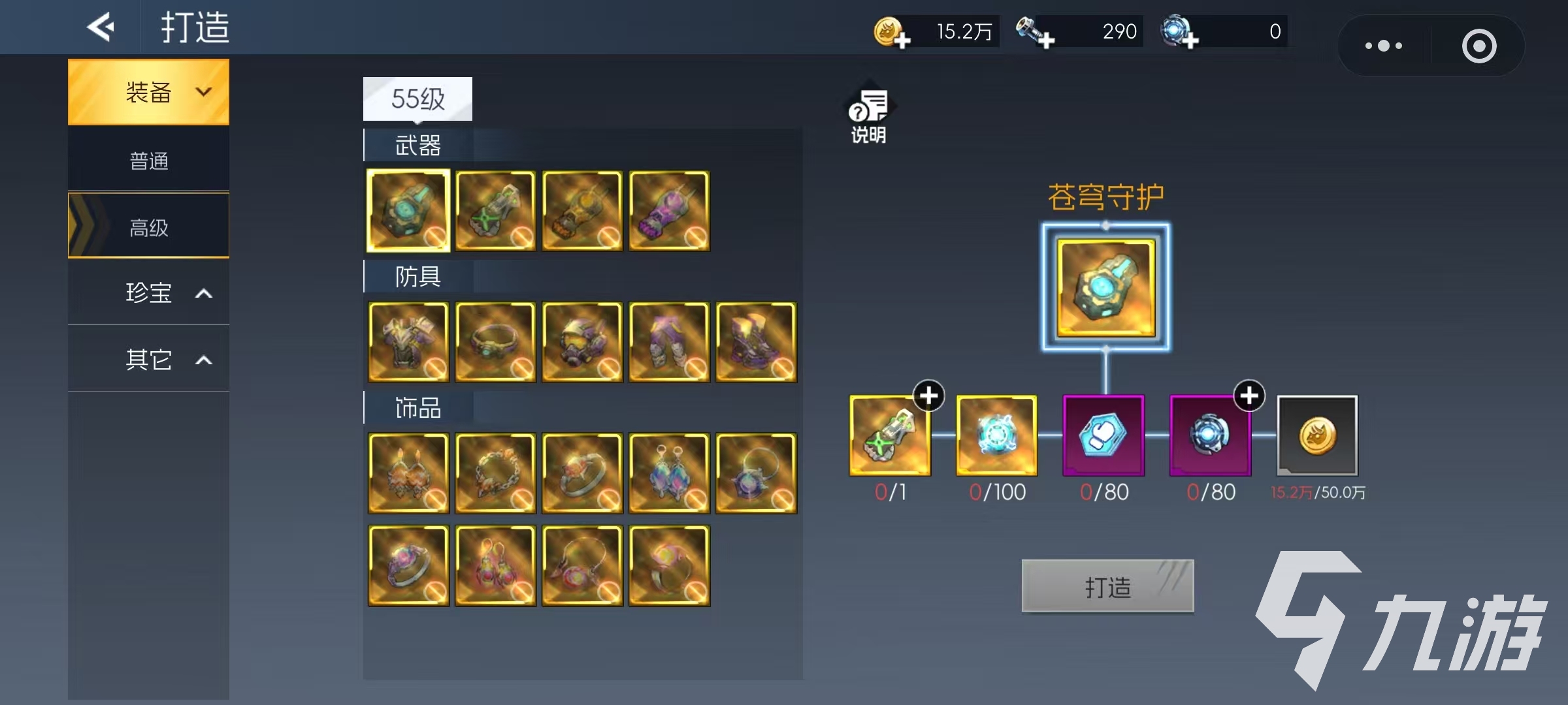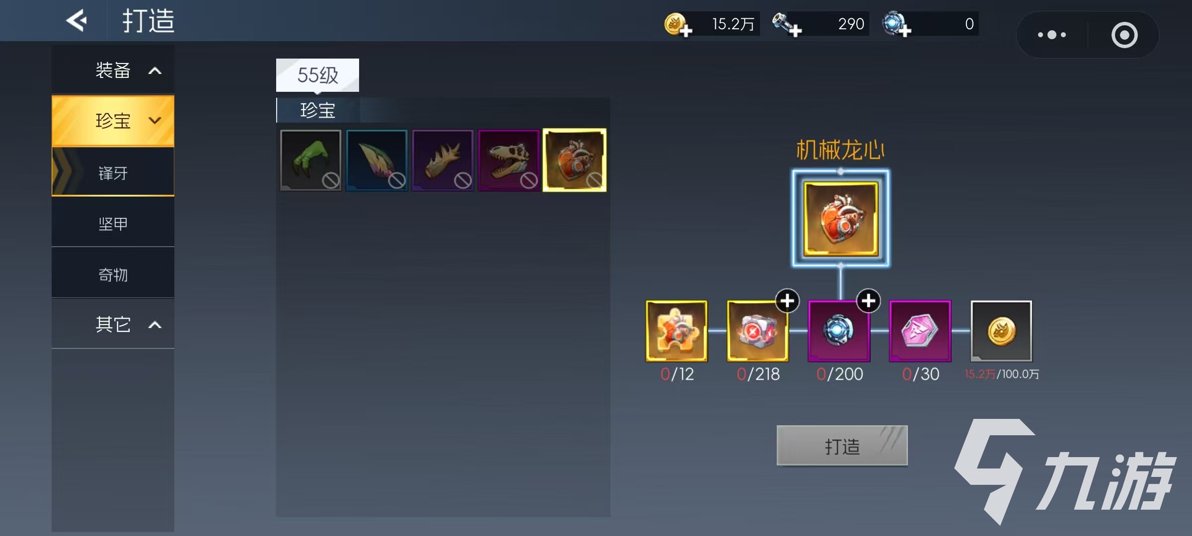 打造玩法解锁之后,点击游戏右下角的变强标志,这里就可以直接看到有打造的功能,注意打造和改造是不同的选项,不要点错。打造一共分为装备,珍宝和其他这三大类。先来看一下装备打造,可以打造武器、防具、饰品等。普通打造只需要靠日常材料就能够完成,如果进行远古打造,那么则需要对应的稀有材料。在龙之巢穴掉落的天空之源,始源龙骸,或者是遗迹宝库产出的精粹钢等,这些都是打造出高级装备的关键材料。