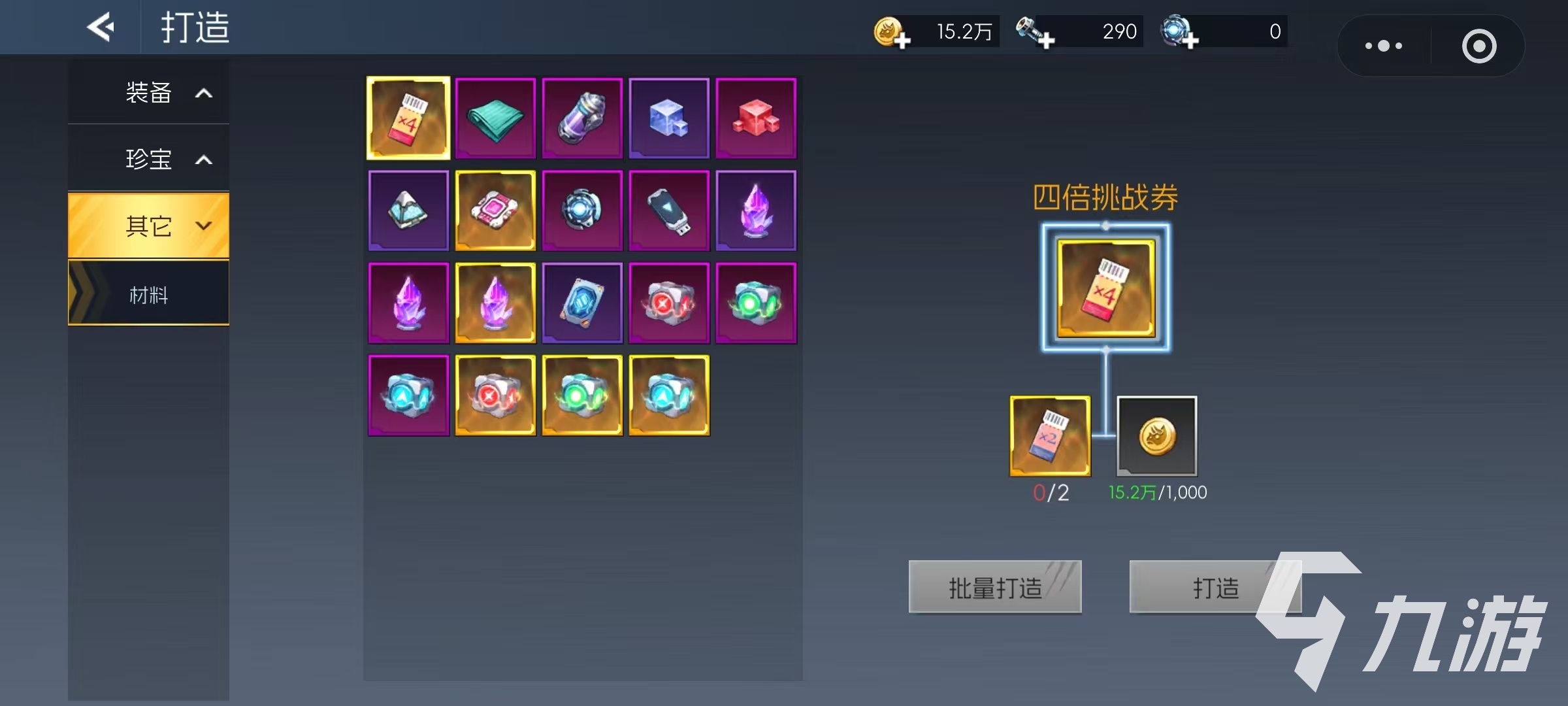 珍宝打造分为三类,分别是锋牙、肩甲和奇物,对应三个不同的珍宝类型。无论想打造哪一款珍宝,都需要找齐对应的材料,材料一般是在逃生之路副本等活动获得。在珍宝洗炼出合适的特性之后,就能大幅度提升挑战boss时的战力,珍宝也是后期战力提升的重要助力。最后是其他,这里主要包括各种材料,例如四倍挑战券、高级强化纤维、强化保护剂、高级变换物质等。四倍挑战卷需要消耗两张双倍挑战券和金币合成得到,高级强化纤维需要消耗强化纤维和金币合成得到,打造高等级的装备,都需要用到这些高等级的材料。