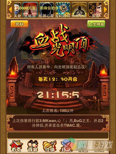 武林萌主每天中午12:30准时开启世界boss,赶快召集好友们齐聚光明顶向世界boss发起进攻吧,时间总共为30分钟,在向世界boss发起多次进攻的同时,玩家在光明顶的排名也在变化,如果在结束时,你的排名在前十的话,将会有丰厚的奖励回馈给你,那是大把大把的银两和装备等等超多的奖励!