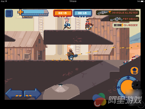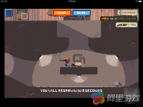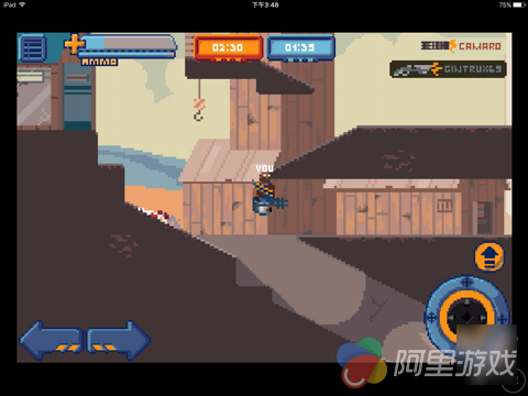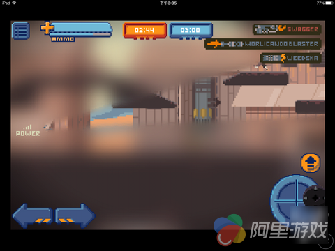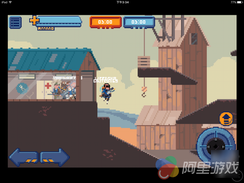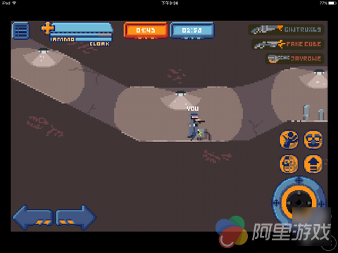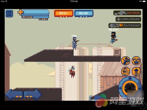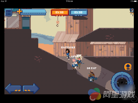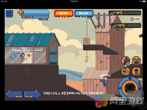 一切准备就绪之后就将正式进入到游戏中,进入战场之后双方都将从本阵营的基地中出发,游戏中采用的是虚拟按键和摇杆结合的操作方式,方向键负责控制角色的移动,而摇杆则负责武器的攻击方向,在摇杆上方则是跳跃键,不得不吐槽这个跳跃键设计的实在是太小了。如果角色有专属技能的话,技能键也将显示在摇杆上方,玩家直接点击即可使用。
