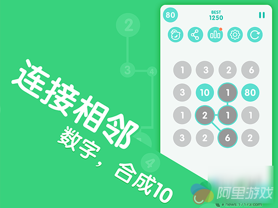 同时连线合成的规则也可以加以运用,我们都知道,在《合十》的游戏中,拖拉一个数字到另外一个数字后,前面的数字会消失替换,后面的数字则会合成10。所以先后顺序就十分重要,在合成10后,周围是否有其他的10可以用来再次合成。往往游戏能否继续下去,每一次的操作先后顺序就很重要。“一步生一念死”在这里可以体现得很明显。