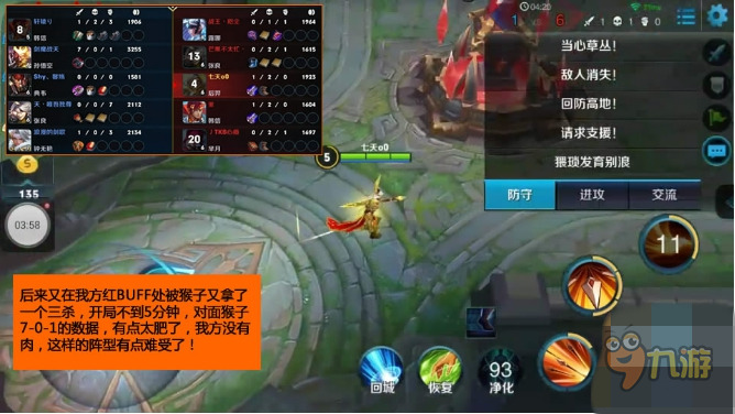 结果河道开团,打了个残局,准备撤退的时候,猴子来了,疯狂收割。