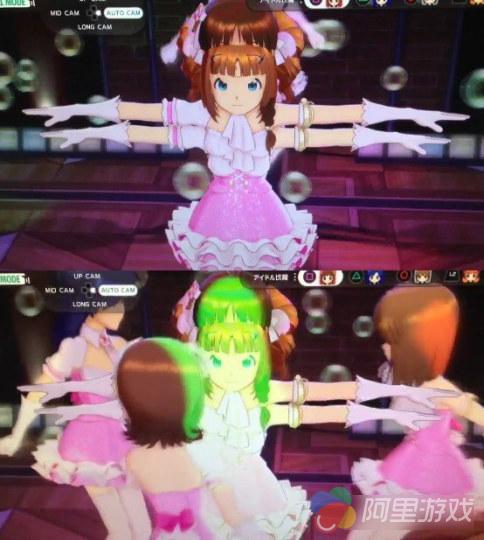 这些BUG基本都出现在爱豆们的舞台歌舞表演中,爱豆们的动作不但定格在双臂平举的动作上,而且还出现了两位偶像合体的情况,比如像下面这样。