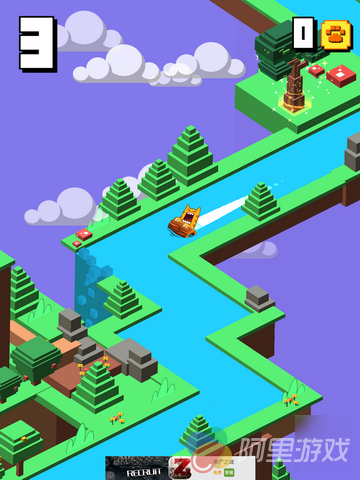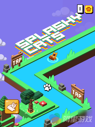 游戏中的操作还是非常简单的,当游戏开始之后喵星人就会抱着浮木开始顺着河流往下漂流,而当面对河道转弯的时候,玩家只需要点击屏幕即可让喵星人改变漂流的方向。游戏初期的河道设计还是非常简单的,不过到了游戏后期河道会越来越复杂,在河道中甚至还会出现一些危险的障碍物,对于玩家的技术要求会越来越高。如果浮木撞到了河道边或者障碍物,那么浮木就会粉碎,而喵星人也会落入水中,一命呜呼。