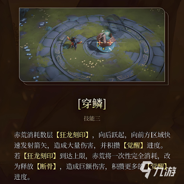 赤荒主打远程输出对战的时候会用弓箭进行射击,战斗的时候可以用普通攻击进行三段式的远程攻击,在第三次攻击的时候还会增加刻痕,这可以继续强化角色的战斗能力,另外也可以利用主动技能盛怒凌空,在基础的射箭形态下,继续叠加强化的蓄力,蓄力之后整体的战斗力会变得更强,给对手产生较高的伤害,也可以选择利用巴鲁克这项辅助技能继续展开攻击,但角色会调整成近距离攻击,每次射击都会在对战的过程中,会不断积攒资源,战斗的时候会继续蓄力爆发。