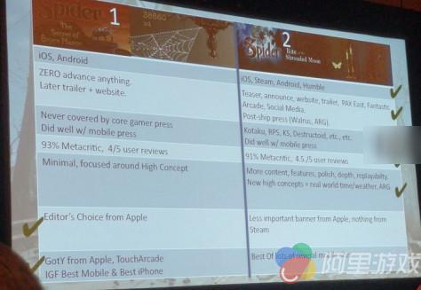 在GDC上,史密斯进行了一次演讲。他阐述了《蜘蛛:博莱斯庄园的秘密》和《蜘蛛:雾月下的仪式》(Spider: Rite of the Shrouded Moon)之间的区别。下面的这张幻灯片做出了总结,并解释了为什么史密斯认为这款游戏是只赚不赔的买卖。