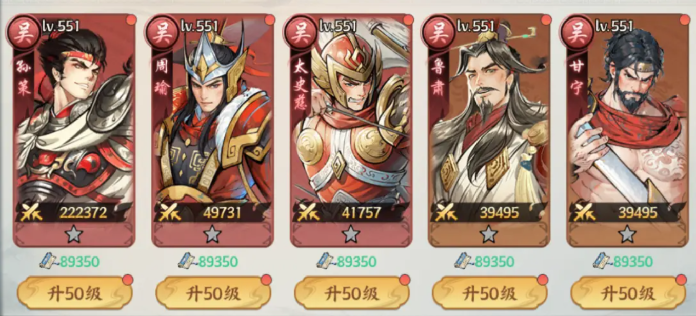 吴国阵营代表的是“持续输出”和“范围灼烧”的极致玩法,适合战术性以及地图控制比较强的玩家。周瑜和陆逊是灼烧的核心,程普、孙策则负责前排以及生存保障。周瑜的“业火”可以给敌方全体带来持续的灼烧,而陆逊的“火计”则可以引爆灼烧产生连锁反应。程普的“持重”承受伤害并反弹,孙策的“激昂”提高整体攻击和生存能力。此阵容攻城战、大团战中表现出色,适合长线对战。若把程普换成太史慈,可以加强单点爆发。